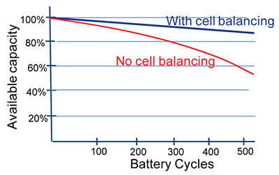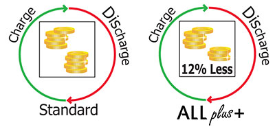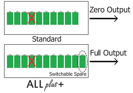 The ALLPlus+ FailSafe technology from CHEEVC provides controlled access to every individual cell in the battery string allowing any cell to be kept on standby and switched in or out of the chain as required. This is used to provide immunity to cell failure. Furthermore it allows each cell to be sequentially bypassed and rested while remaining cells carry the load. This provides regular rest periods for every cell in the chain, reducing the stress to which they are subjected, resulting in increased battery life.